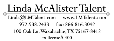 Now I’ve got one, too. I just signed with Linda McAlister Talent — even though she has the same last name as my sister and my cousins, she’s not a relative.