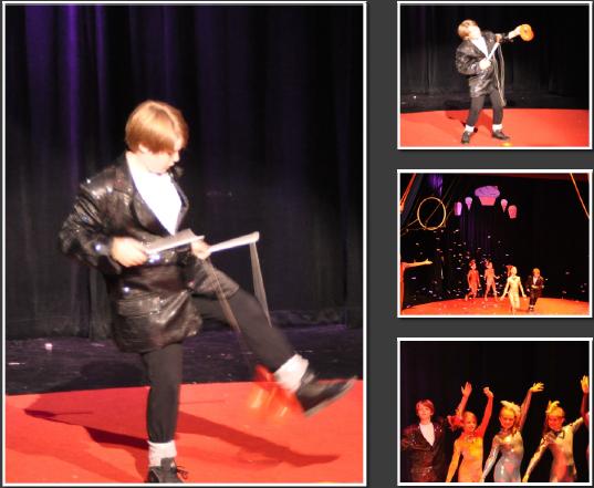 These are some photos of me from the Saturday Matinee. The pictures on the left and at the top are from my diabolo routine, and the other two are from the finale. That last one is me “holding the pose” while everyone else takes their bows. Your arms get tired, but it’s important to show respect for the other performers and wait quietly while they get their turn in the spotlight.