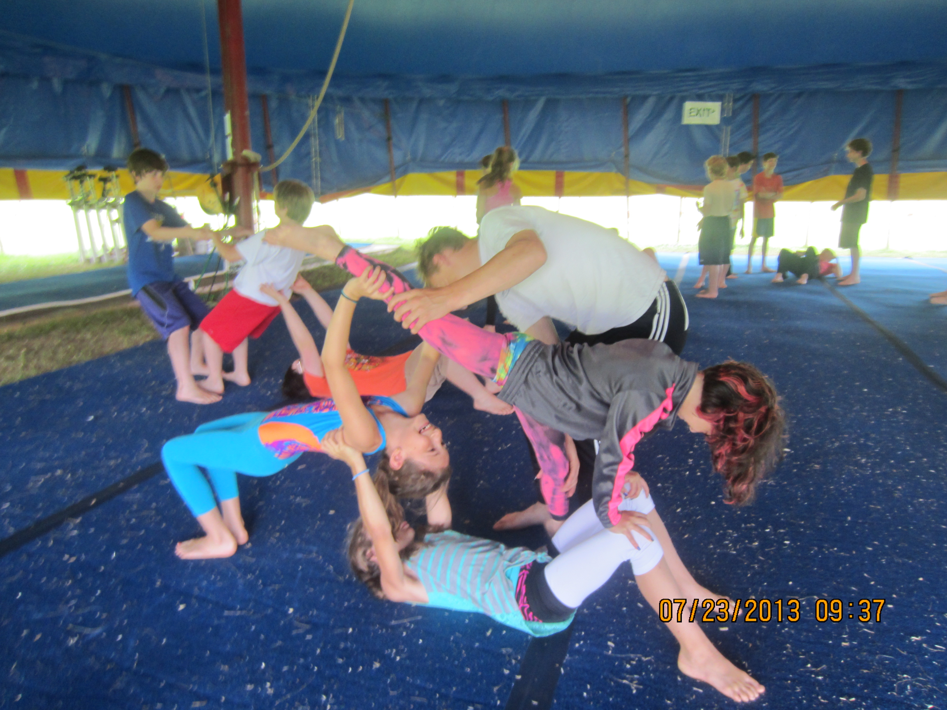 Acro class Circus Smirkus Session IV 2013. (Kameron is in the red shorts & white T-shirt in the upper left of this photo.)