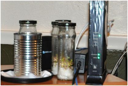 This is the location with 5 Wi-Fi Bars, showing the hydroponic samples. Each jar has 2 grams of radish seeds, three cotton balls and 10 milliliters of water. The lids were loose, not tight, so there was some air circulation.