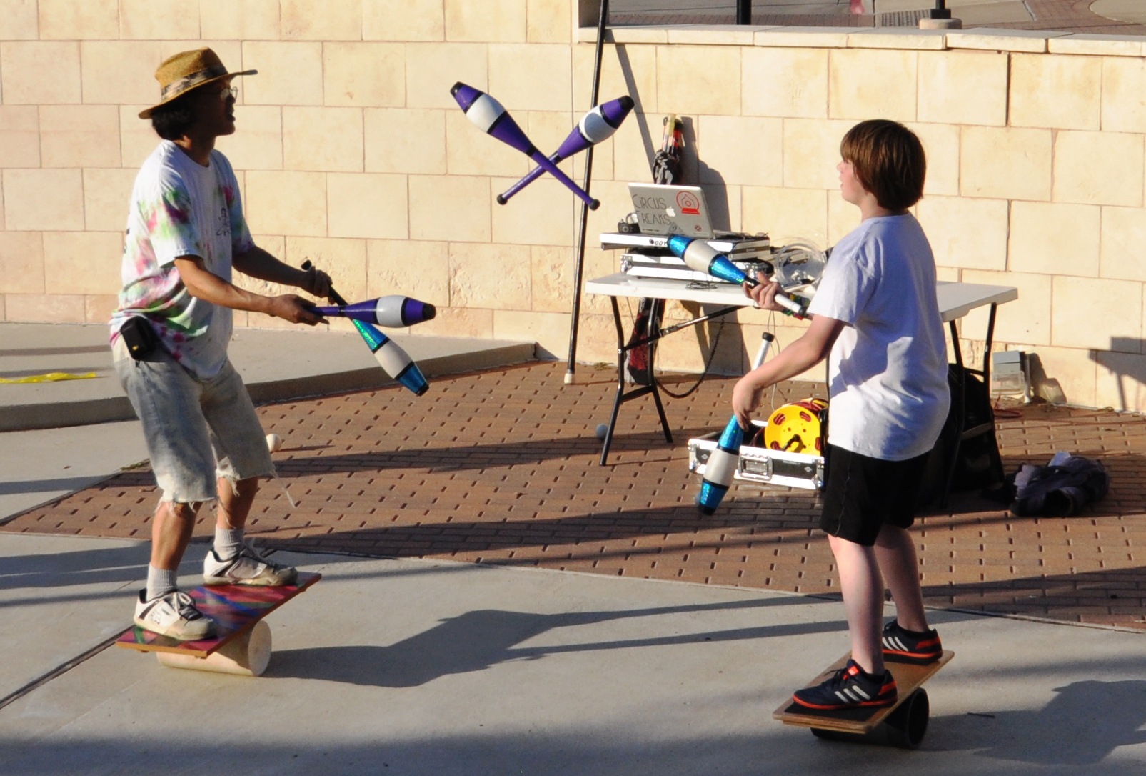 Yesterday was a blast — I did some things I’ve never tried before, like four-way passing, passing clubs while both jugglers are on a rola bola, and passing “uphill” where one juggler is on a different level than the other. And, as always, one of the fun things is watching little kids learn something new for the first time — there was one little boy who had never tried a diabolo before, and Katsu showed him how to do it. He had the biggest smile ever when he got it going!