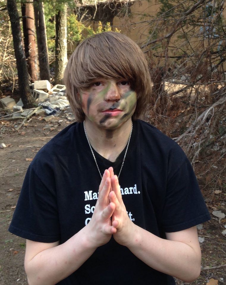 We were on the grounds of an old abandoned factory on the outskirts of town. The director (Tyler Hill) put some kids and a couple of “moms” in camouflage gear — complete with face paint — and filmed us having a ball with the Nerf guns.